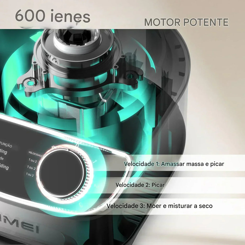 O motor de 600 W oferece força para triturar, cortar, fatiar, picar e processar diferentes tipos de alimentos com eficiência. São três velocidades e função pulso para precisão total. O painel metálico com botões premium proporciona experiência de uso moderna e intuitiva.